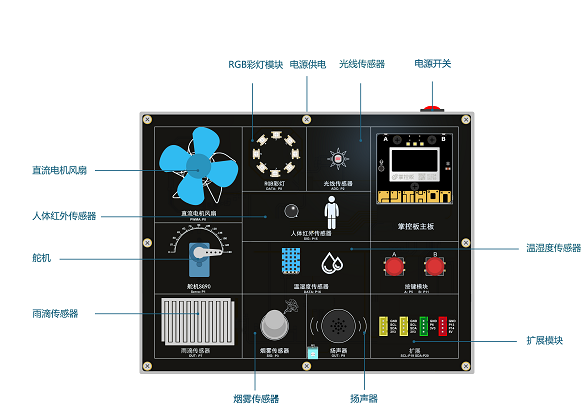 1、包含人體紅外傳感器、光線傳感器、溫濕度傳感器、RGB彩燈、直流電機(jī)風(fēng)扇、舵機(jī)、雨滴傳感器、揚(yáng)聲器、擴(kuò)展模塊等。
