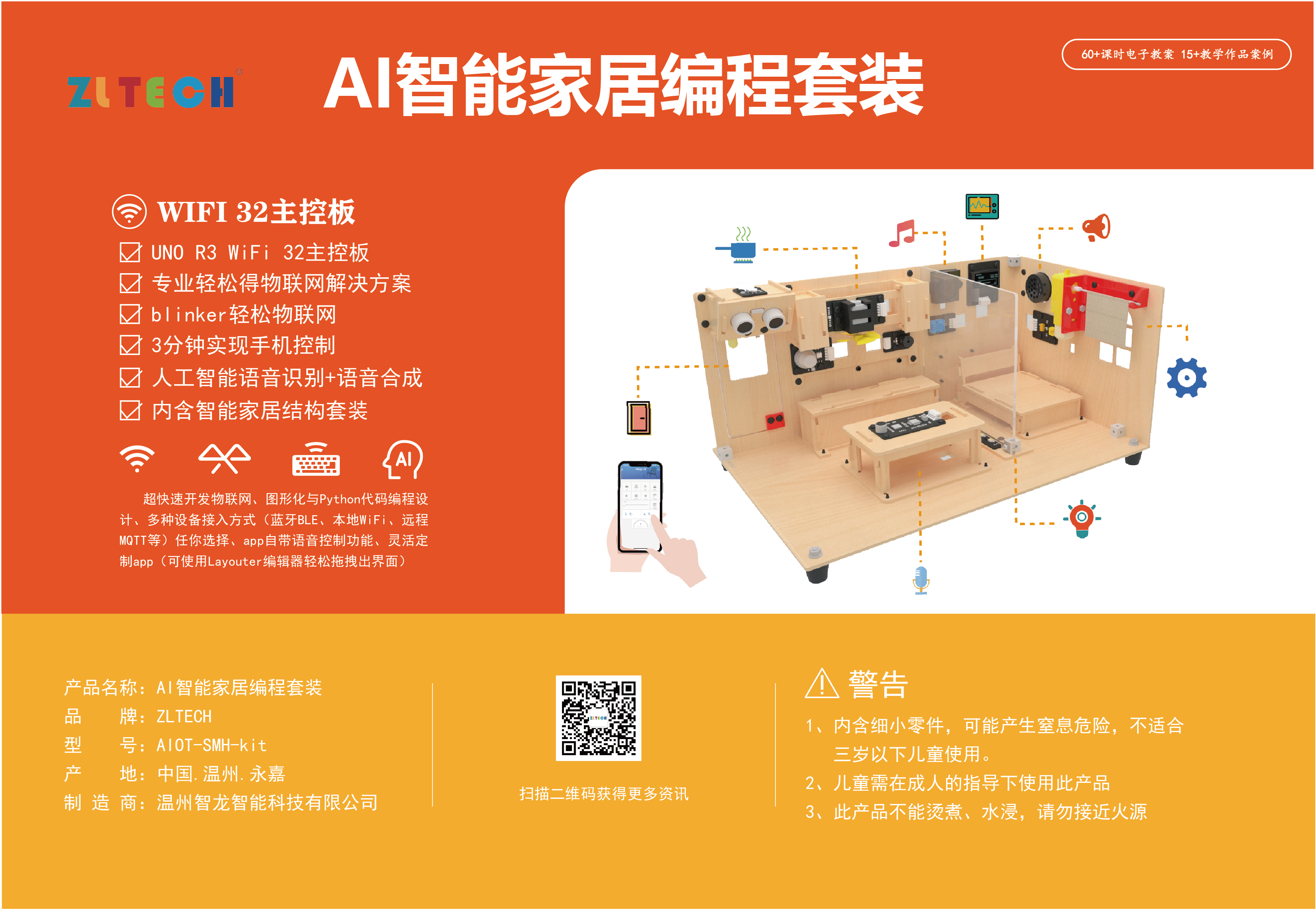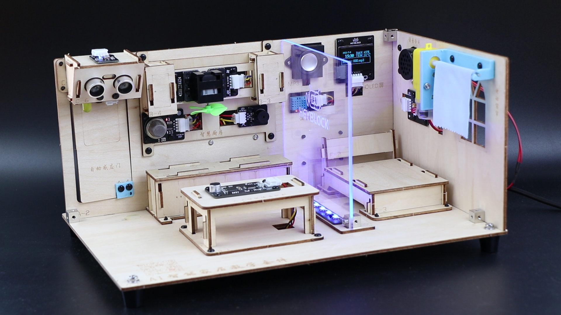 2、AI智能家居教學(xué)套件可根據(jù)圖形化編程可實(shí)現(xiàn)相應(yīng)的功能:第一,自動燈光與自動感應(yīng)門功能,利用光敏傳感器與LED實(shí)現(xiàn)自動燈光,利用超聲波傳感器與舵機(jī)實(shí)現(xiàn)自動感應(yīng)門功能;第二,智慧廚房功能,當(dāng)煙霧傳感器檢測煙霧達(dá)到一定數(shù)值時,廚房排風(fēng)風(fēng)扇電機(jī)會自動打開,當(dāng)煙霧濃度達(dá)到較高時,蜂鳴器警報(bào)會想起,且同時自動打開排風(fēng)風(fēng)扇;第三,AI智能家居還能將溫濕度傳感器檢測的溫度與濕度實(shí)時顯示在1.3寸的OLED屏幕中,且OLED還同時顯示當(dāng)前日期、時間與MP3當(dāng)前播放的MP3歌曲序號;第四,AI智能家居還能根據(jù)AI語音識別模塊與語音合成模塊進(jìn)行人工智能語音交互自動開燈、開門、選擇燈光模式、門禁模式、打開關(guān)閉炫彩燈、自動控制窗簾、自動播放MP3音樂、自動切歌、調(diào)節(jié)音量等;第五,AI智能家居還可利用手機(jī)APP進(jìn)行遠(yuǎn)程交互控制,包括在手機(jī)APP查看當(dāng)前室內(nèi)溫度、濕度、廚房煙霧濃度等參數(shù),并利用手機(jī)APP對智能家居進(jìn)行相應(yīng)的功能控制,包括開關(guān)門、開關(guān)燈、炫彩燈開關(guān)、廚房排風(fēng)開關(guān)、音樂播放、調(diào)節(jié)音量、切歌、控制窗簾等功能;